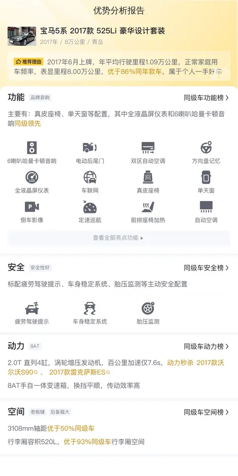 在考虑购买二手车时,除了购车成本外,还需要合理预期日后的用车费用。基于大数据分析,我们可以为您提供一个大致的年度用车成本估算,以助您做好财务准备。通常,2017款宝马5系525Li豪华设计套装的年均使用成本大约在2万元左右,但这也会随车辆的具体使用情况及维护水平而有所浮动。