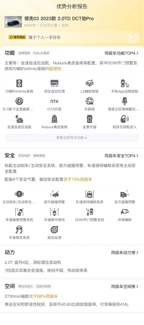 综上所述,这辆领克03 2023款 2.0TD DCT劲Pro在车况、配置、动力、驾乘感受等方面都有着不错的表现。尤其是车辆经过全面检测,排除了事故、泡水、火烧等潜在风险,让人更加放心。同时,车辆搭载的丰富配置和强劲动力,也为车主带来了良好的驾乘体验。当然,作为一款紧凑型轿车,领克03在空间上还是有一定局限性,但这并不影响其作为一款高品质家用轿车的形象。总的来说,如果您正在寻找一款性价比高、品质可靠的紧凑型轿车,那么这辆领克03无疑是一个不错的选择。