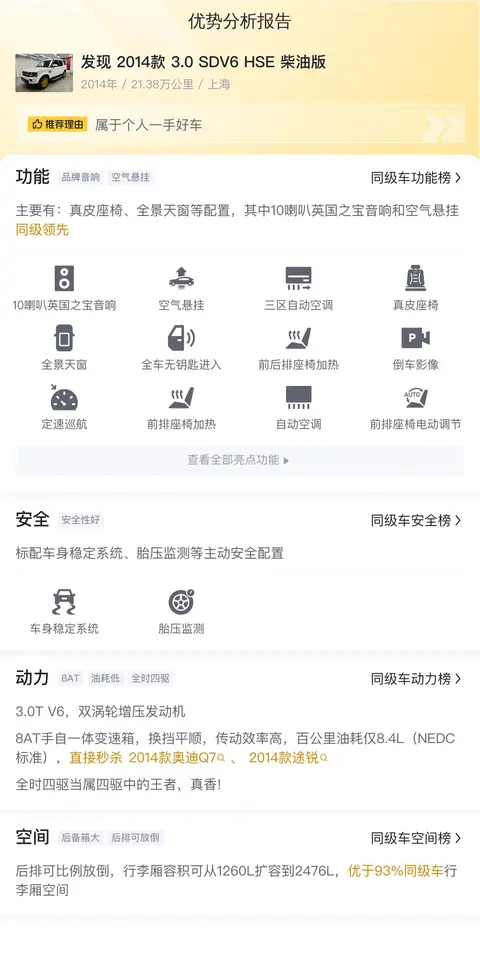 综上所述,发现 2014款 3.0 SDV6 HSE 柴油版是一款集豪华与实用于一身的中大型SUV。它在动力、内饰、安全配置等方面均表现出色,为驾驶者和乘客提供了卓越的驾乘体验。然而,购车时也需要考虑到车辆的油耗、维护成本等因素。如果您正在寻找一款性能卓越、配置豪华的二手SUV,那么发现 2014款 3.0 SDV6 HSE 柴油版无疑是一个值得考虑的选择。但请记住,每一辆二手车都是独一无二的,只有通过全面细致的检查,才能确保您所购买的车辆物有所值。祝您购车愉快!