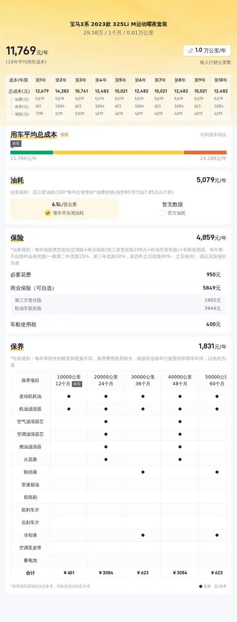 另外,同级车的最低10年平均用车成本是6141元/年,最高是14740元/年,宝马3系 2023款 325Li M运动曜夜套装是12135元/年,适中的水准。