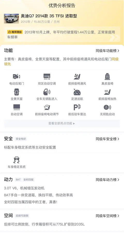 优势:整体来看,这辆奥迪Q7 2014款 35 TFSI 进取型的性价比还是不错的,适合商务也适合家用,空间宽敞,舒适度高,售价不高,入手压力不大。11.88万就能买到当初百万级的豪华中大型SUV,性价比突出。