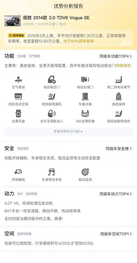 综上所述的新车含税价、用车成本、市场行情、优势分析、同款比价等数据仅供参考。在配置部分,因为二手车非标品,车辆可能会存在配置改装的情况,具体车况信息需要线下结合车辆实际情况进行综合参考。