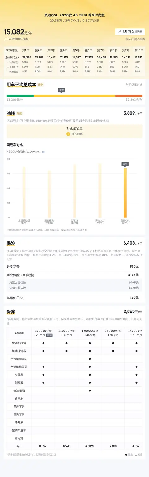 在用车成本方面,根据懂车帝平台的分析,奥迪Q5L 2020款 45 TFSI 尊享时尚型的10年平均用车成本大约为15445元/年,这一数字在同类车型中处于较高成本的范畴。需要注意的是,实际费用支出会根据车主不同的驾驶和使用习惯有所改变。