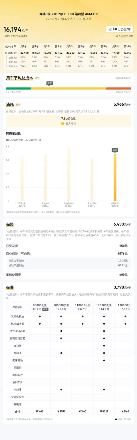 同样,买卖双方最关心的还有购车成本和用车成本。除了购车时的花费外,我们还分析了这款车10年平均用车成本,这里说的用车成本就是油钱、保险和保养的费用。根据懂车帝的数据,这款车的10年平均用车成本约为15707元/年,当然具体费用还是要根据车辆的实际使用情况而定。
