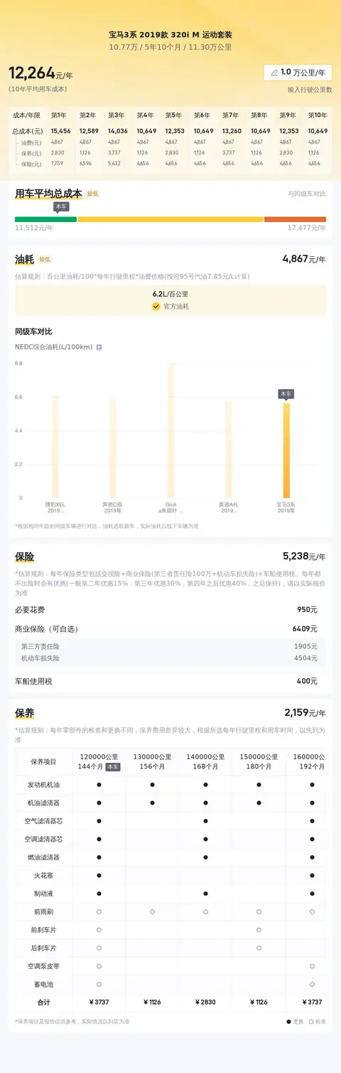 除了价格方面,我们还需要考虑这辆车的用车成本。根据估算,这辆车的年均综合用车成本大概在每年1.2万元左右。