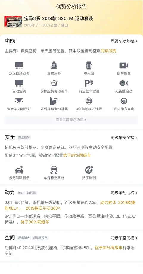 今天给大家带来的一辆宝藏二手车——宝马3系(图片|配置|询价) 2019款 320i M 运动套装。这款车型号是2018年12月在佛山上的牌照,至今行驶了11.3万公里,不仅有着出色的动力性能和操控稳定性,还拥有宽敞舒适的乘坐空间和丰富的配置,能够满足不同消费者的需求。如果你想购买一辆既能满足日常出行需求,又能在周末驾驶时给你带来驾驶乐趣的车型,那么宝马3系 2019款 320i M 运动套装将是一个不错的选择。现在,就让我们来一起了解一下这款车的具体情况吧!