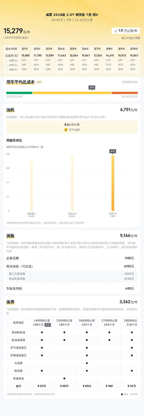 关于用车成本,根据懂车帝对威霆2018款2.0T精英版7座国V的分析,其10年平均用车成本约为15,270元/年,这一数字较同级别车型处于适中区间。具体到各项支出,加油费用年均约13,117元,保险费用年均约4,364元。保养费用方面,年均约1,080元。值得注意的是,这些成本估算未考虑贷款利息、洗车和停车费等因素,实际花费可能因地区差异、油价波动及个人驾驶习惯而有所不同。
