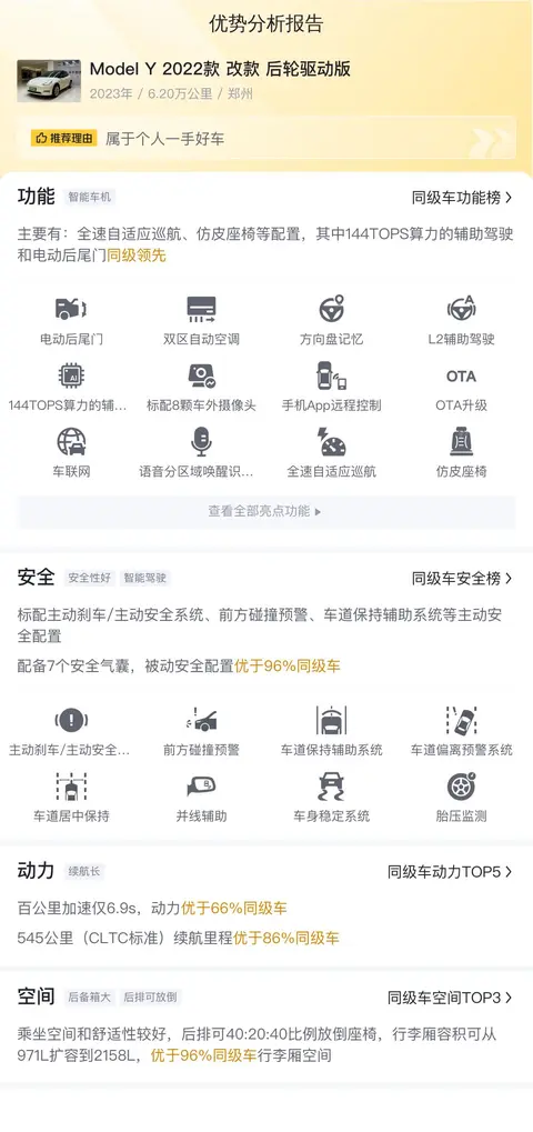 在考虑购买二手车时,除了购车成本,还需要考虑日常使用、保养以及保险等费用。基于懂车帝对Model Y 2022款 改款 后轮驱动版的综合分析,我们可以为您提供一个大约的年度用车成本参考:约22,155元。这一估算涵盖了燃油费用、保养费用及保险费用等各个方面。其中,电费成本相较于燃油车的油费具有明显优势;同时,根据预估保养费用约为7,040元,保险费用约为5,520元。这些费用将随着车辆使用年限的增加而逐渐降低,特别是保险费用会因无理赔记录而逐年递减。