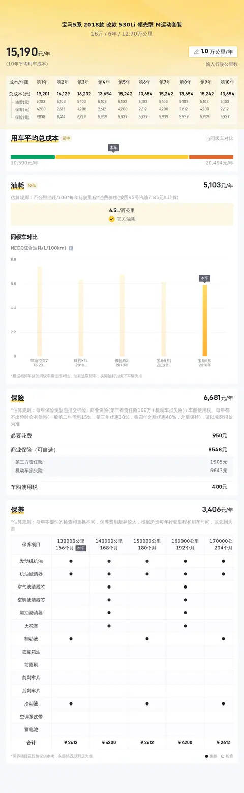 此外,据估算,同级车的最低用车成本是12468元/年,最高是18220元/年,而宝马5系 2018款 改款 530Li 领先型 M运动套装是15132元/年,所以用车成本不算低。