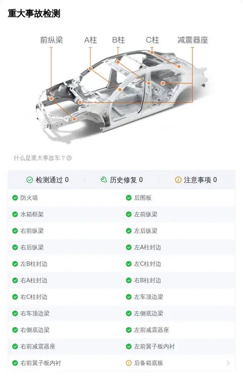 二手车不同于新车,在日常使用中难免会发生一些小意外。比较常见的就是车辆外观覆盖件划伤、剐蹭、划痕、喷漆修复、钣金修复、凹陷、变形等,对于此类小瑕疵,虽然在检测项中会被查出来判定为瑕疵项,但整体并不影响车辆的安全性。总结说一下,如果车辆通过了重大事故、泡水、火烧检测检测,那么说明这辆车的整体车况没有大问题,这个您放心就行。
