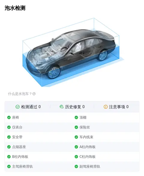 除了外观瑕疵外,车辆还经历了事故、泡水和火烧检测。在事故检测方面,车辆22项均通过,仅后备厢底板有脏污。泡水检测方面,车辆11项均通过,无泡水痕迹。火烧检测同样通过,未发现火烧迹象。