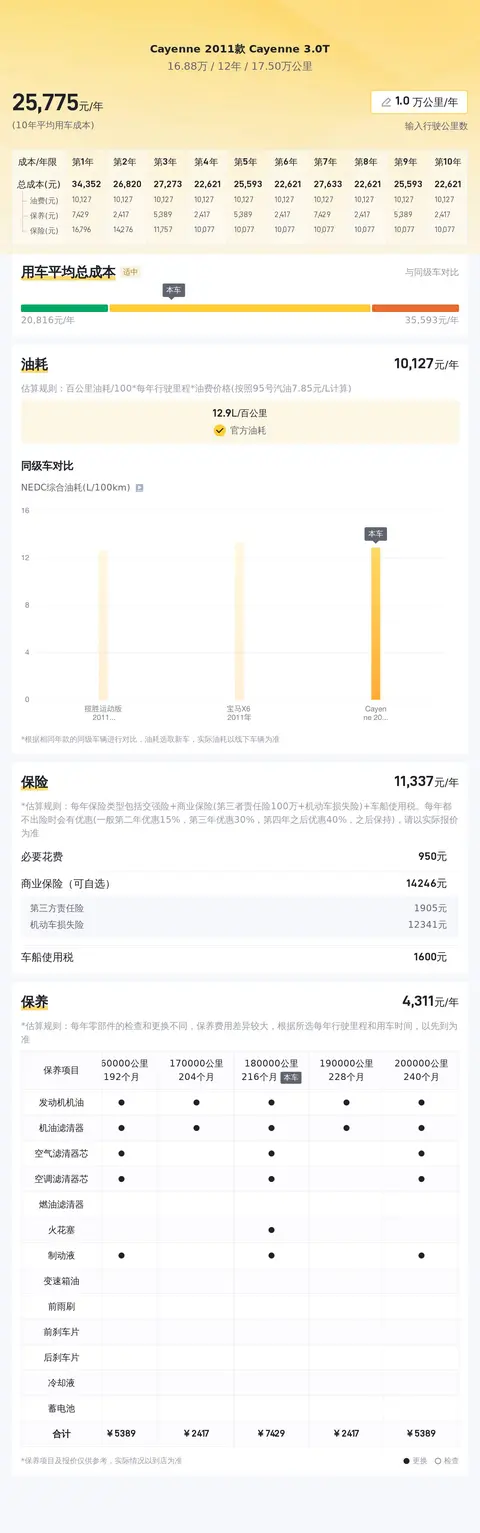 据估算,Cayenne 2011款 Cayenne 3.0T的用车成本较低,因为同级车的最低用车成本是25952元/年,最高是45221元/年,而Cayenne 2011款 Cayenne 3.0T的是26320元/年,所以较低。
