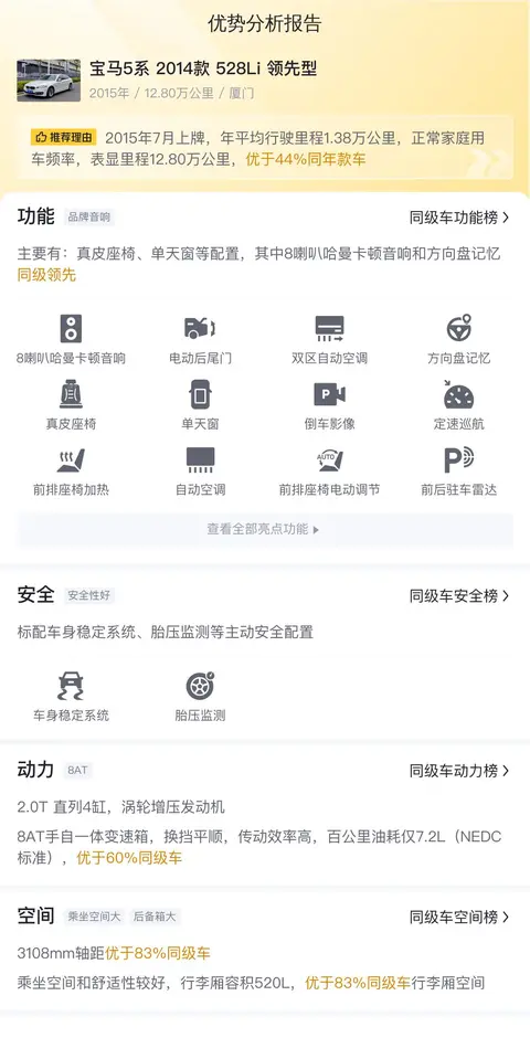 当前市场上,这款宝马5系2014款528Li领先型的二手车价格在9.22万元到12.19万元之间。具体的价格因车辆的车龄、里程以及保养情况等不同情况而定,而本车12.8万的报价则基本上处于市场高价的水平,这需要购车者根据实际情况和需求来综合考虑和选择。