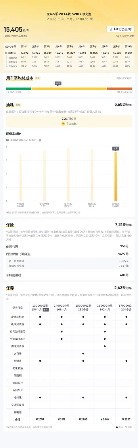 根据懂车帝平台的大数据分析,这款宝马5系2014款528Li领先型的10年平均用车成本大约在14681元/年,而按照每年2万公里里程计算,平均油耗约为8.1升/百公里。这一数据与同级别车型相比处于较高水平,这主要是因为这款车采用了高性能的发动机和配置,从而带来了更高的油耗和保养成本。然而,对于追求品质和驾驶乐趣的消费者来说,这些成本可能是他们愿意承担的。同时,也可以通过一些节能驾驶习惯和定期保养来降低用车成本。