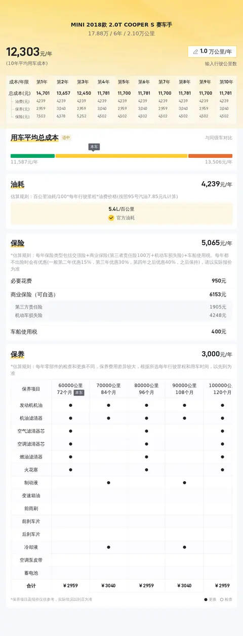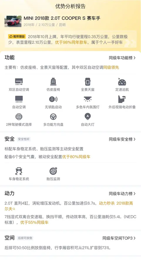 这辆二手MINI赛车手版,新车含税价是31.69万,现在二手报价17.88万,比新车便宜了11.1万,2018年10月上的牌,到现在车龄6年,一共跑了2.1万公里,一年平均也就开3000多公里,开的并不算多,这车在昆明售卖,没出过云南省,也没过户过,是国五排放标准。