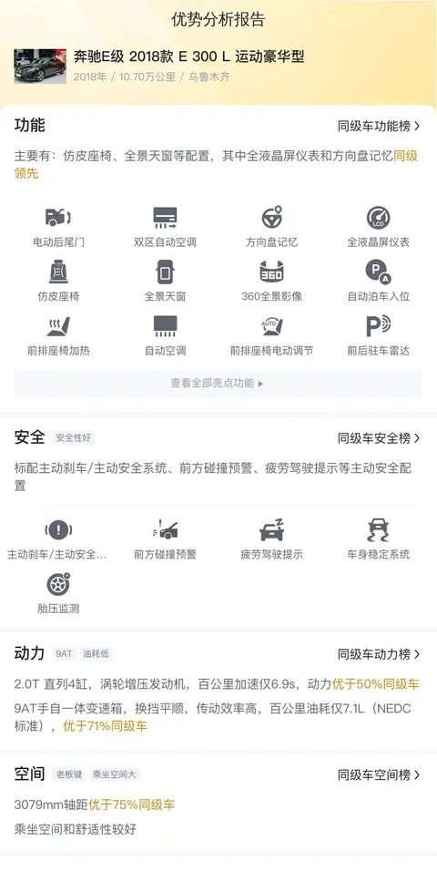 本次我们要介绍的是一款奔驰E级 2018款 E 300 L 运动豪华型,属于中大型轿车级别,搭载了2.0T涡轮增压发动机,采用后轮驱动设计。这款车的新车指导价为49.98万元,目前二手车报价为23.58万元。上牌日期为2018年7月,上牌地点和车源所在地均为乌鲁木齐,目前已经行驶了10.7万公里。车身颜色为黑色,有1次过户记录。