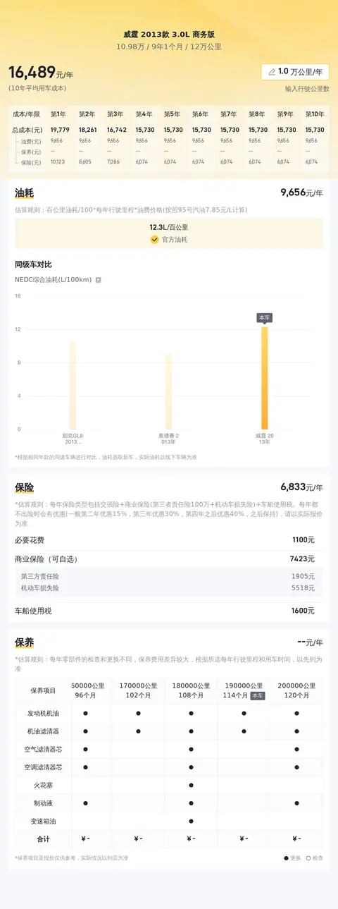 威霆2013款3.0L商务版是一款中大型MPV,车身尺寸为5223x1901x1872mm,轴距达到了3430mm,为乘客提供了宽敞舒适的乘坐空间,无论是商务出行还是家庭旅行,都能轻松应对。动力方面,它搭载了一台3.0L V6自然吸气发动机,最大功率为165kW,最大扭矩为290N·m,动力表现强劲,能够满足各种驾驶需求。同时,它的NEDC综合油耗仅为12.3L/100km,相对较低的油耗表现让驾驶更加经济实惠。根据估算,这辆车的年均综合用车成本约为1.6万元左右,实际费用根据车主的使用习惯和环境等因素会有所变化。