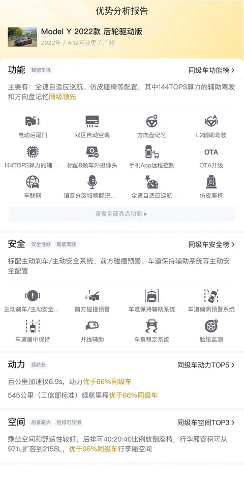 在用车成本方面,根据懂车帝对Model Y 2022款 后轮驱动版的大数据分析,预估其年均综合用车成本约为2.6万元。重要的是,请注意实际费用会根据车主的实际使用强度和用电习惯等因素有所变动。