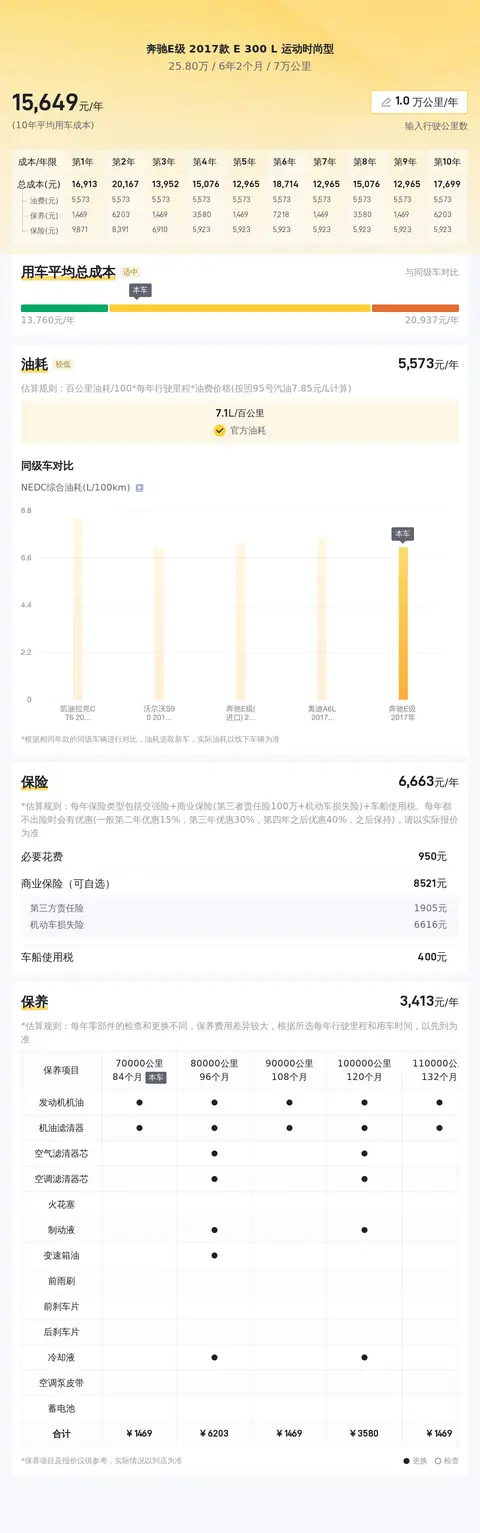 接下来,我们来谈谈这辆二手奔驰E级的使用成本。根据懂车帝的大数据分析,该车的10年平均用车成本约为16181元/年,这一成本在同级别车型中处于合理区间内。其中,油费约为11111元/年,保养费用约为3182元/年,保险费用约为9888元/年。值得一提的是,由于车辆已行驶一定里程,未来可能会有较多的维修和保养需求,因此保养费用相对较高。相比之下,油费和保险费用则相对较为合理。