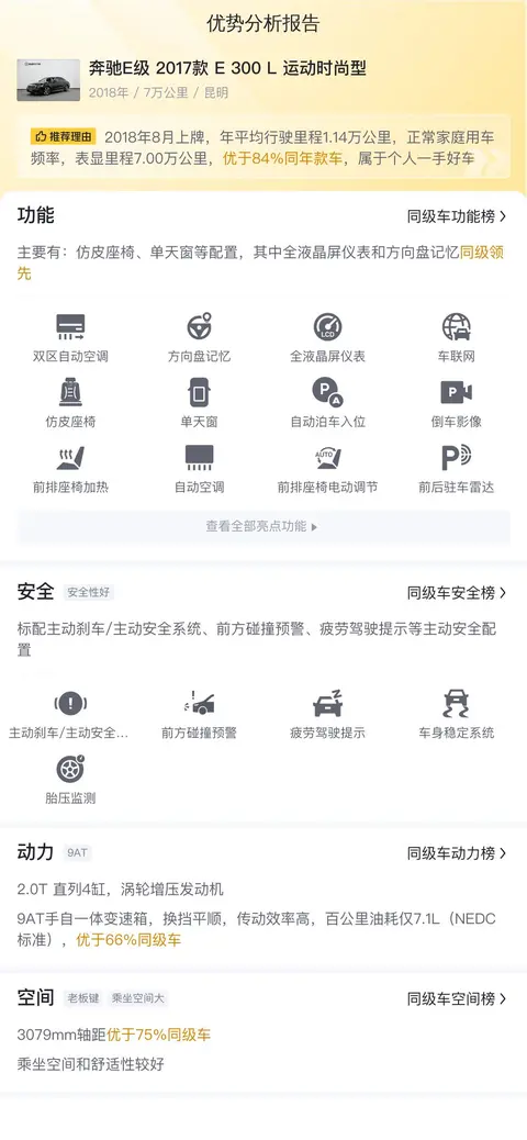 在选择车型时,了解其优劣势是至关重要的。这辆奔驰E级在动力性能、内饰材质、乘坐舒适度,以及品牌形象方面具有明显优势。首先,其2.0T 245马力的L4发动机提供了强劲的动力输出,确保了顺畅的驾驶体验。其次,真皮座椅与全景天窗等高端配置营造出奢华的内饰环境,而宽敞的内部空间则保证了乘坐的舒适度。最后,奔驰品牌的知名度与口碑为车主带来了较高的社会认可度。
