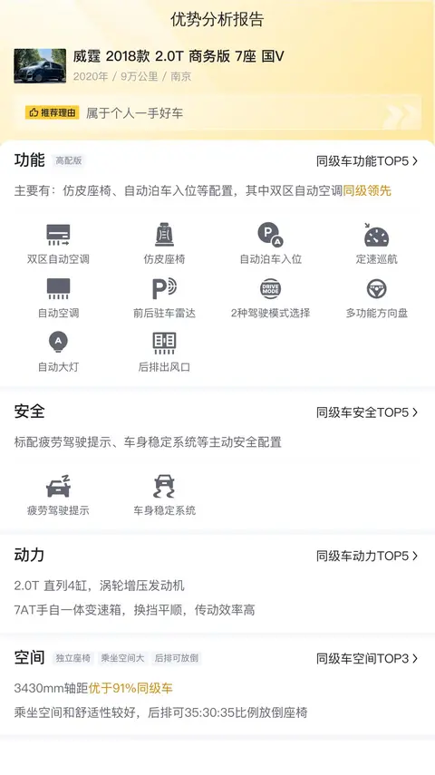 优点:威霆 2018款 2.0T 商务版 7座 国V的市场行情价是23.75万-29.33万,它的报价则是23.38万,价格上有优势。另外,该车属于热门车型,市场欢迎度高,保值率高。从内饰上看,使用痕迹较少,保养不错。加上知名品牌赋能,形象好,有面子。