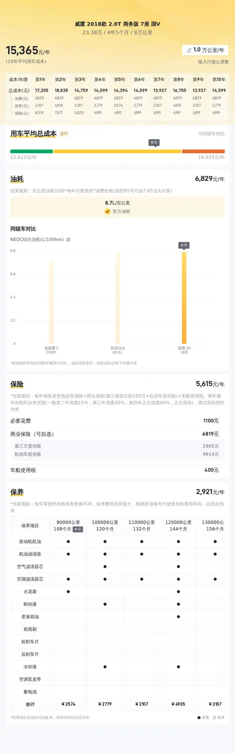 另外,同级车的最低10年平均用车成本是14973元/年,最高是17729元/年,威霆 2018款 2.0T 商务版 7座 国V是15476元/年,用车成本适中,不占优势。