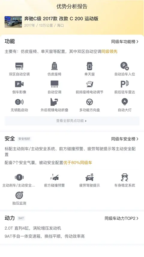 据估算,同级车的最低用车成本是13106元/年,最高是16423元/年,奔驰C级 2017款 改款 C 200 运动版是14180元/年,所以用车成本适中。