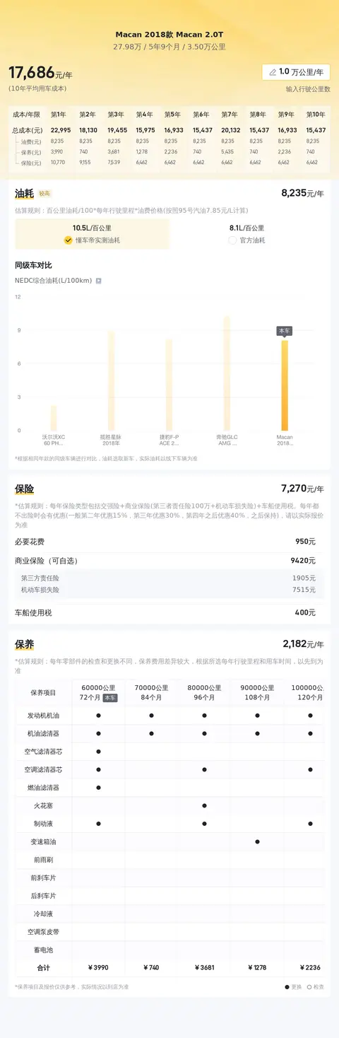 据估算,同级车的最低用车成本是14953元/年,最高是22700元/年,Macan 2018款 Macan 2.0T是17683元/年,用车成本适中。