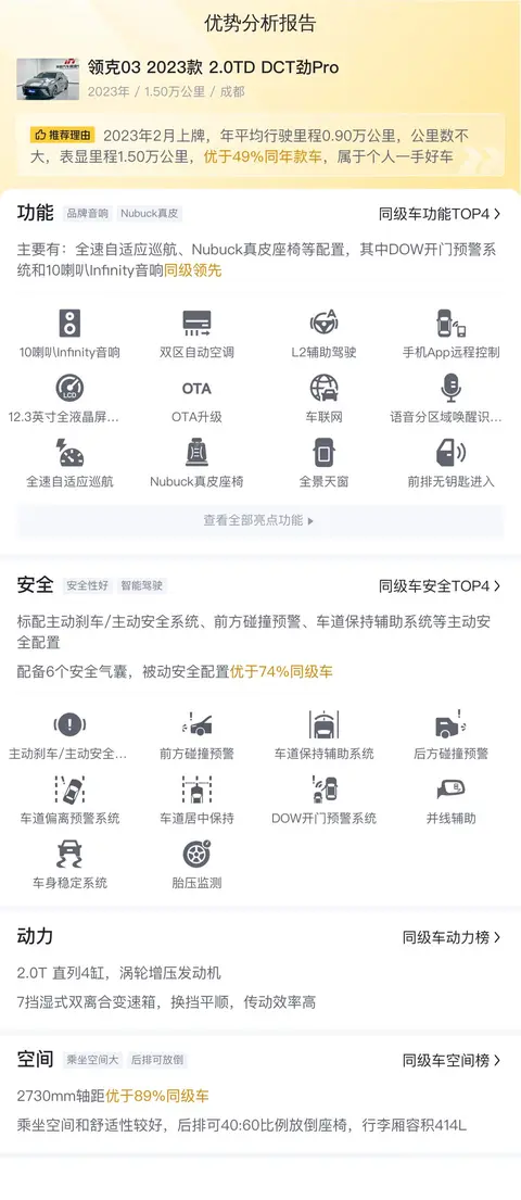 在选购二手车的过程中,比较自家选中的车型与同级别竞品,能帮您突出识别该车型的优势和弱点。我们为您制作了对比分析报告,接下去我们一起来看看本车在安全性、动力和空间方面与竞品车型的对比情况。