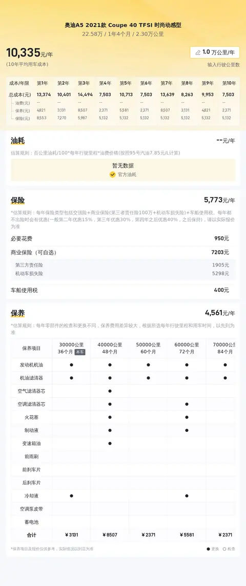 在用车成本方面,这辆奥迪A5 2021款 Coupe 40 TFSI 时尚动感型的平均每年花费大约在1.3万元左右。具体包括油费约6685元/年,保险费用大约5104元/年,保养费用2047元/年。值得注意的是,实际费用支出会根据车主的使用习惯和维护情况而有所变动。