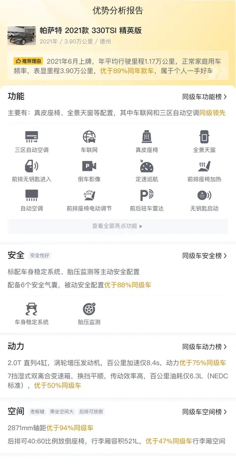 报价相对较低,帕萨特 2021款 330TSI 精英版的市场行情价是10.90万-13.13万,它的报价则是11.90万,价格上有很大优势,同时保值率也高。
