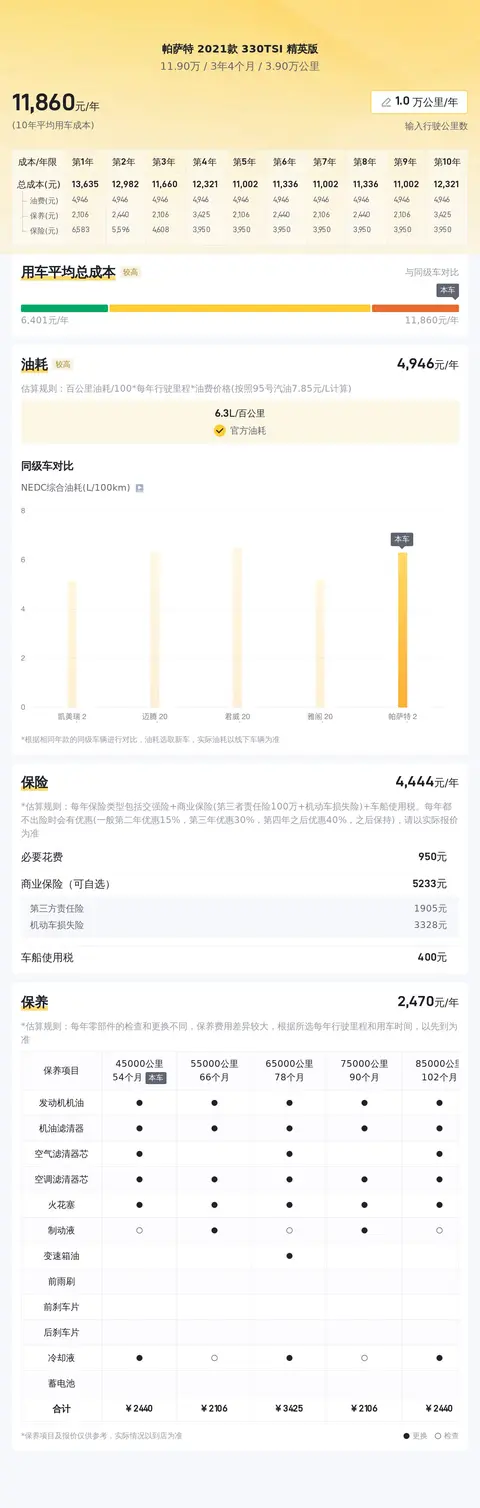 据估算,同级车的最低用车成本是6506元/年,最高是12254元/年,帕萨特 2021款 330TSI 精英版是12254元/年,所以用车成本相对较高。