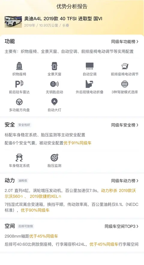 这辆奥迪A4L 2019款 40 TFSI 进取型 国VI是一辆中型白色轿车,车源地为长春,上牌日期为2019年6月,表显里程为10.93万公里,有2次过户记录。按照懂车帝对汽车年龄的划分,这辆车属于壮年车,已使用5年4个月。目前该车报价为13.28万元,比新车指导价便宜了16.8万元。
