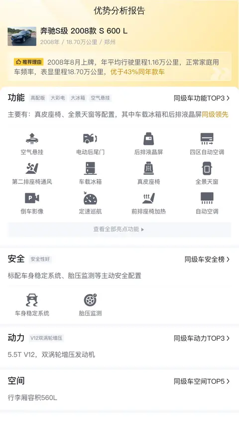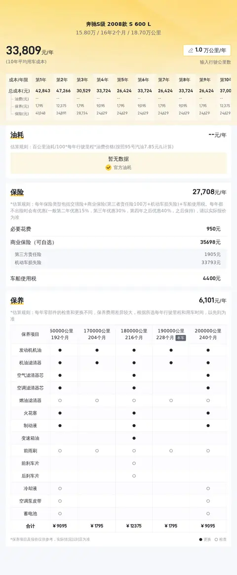据估算,奔驰S级 2008款 S 600 L的用车成本是31158元/年,毕竟动力强,油耗大,所以用车成本不算低。