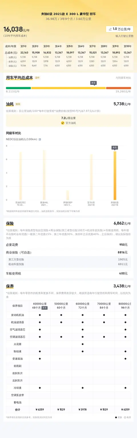市场行情也是决定这款车价值的重要因素。目前,这款奔驰E级的二手车行情大致在32万至40万之间。此外,根据估算,这辆车的年均综合用车成本约为1.5万元,当然具体用车成本金额还是根据车辆的实际使用情况而决定的。