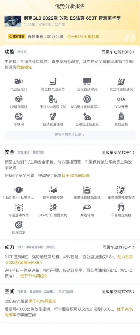 综上所述的新车含税价、用车成本、市场行情、优势分析、同款比价等数据仅供参考。在配置部分,因为二手车非标品,车辆可能会存在配置改装的情况,具体车况信息需要线下结合车辆实际情况进行综合参考。