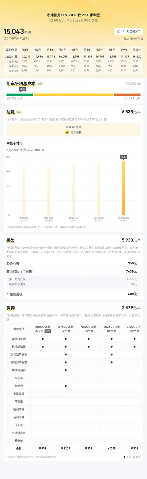 据估算,同级车的最低用车成本是12778元/年,最高是17576元/年,凯迪拉克XT5 2018款 25T 豪华型是15138元/年,用车成本适中,具体还需以实车为准。