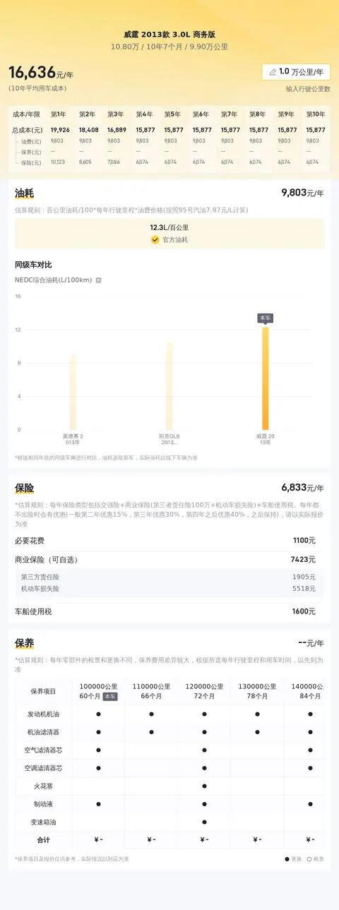 市场行情显示,这款车型的二手车价格大致在6.66万至9.14万之间。当然,具体的售价会受到车辆状况等因素的影响。关于用车成本方面,根据估算,这辆威霆 2013款 3.0L 商务版的年均综合用车成本大约为1.7万元左右,实际费用支出会根据车主的使用习惯和选择的保险等因素有所变动。