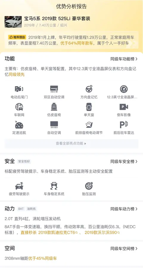 据估算,同级车的最低用车成本是7105元/年,最高是16783元/年,宝马5系 2019款 525Li 豪华套装是15138元/年,所以用车成本较高。