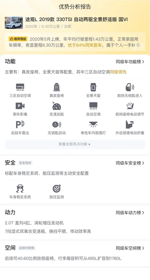 途观L(图片|配置|询价)是上汽大众推出的一款中型SUV,作为途观的长轴距版本,它于2016年底正式亮相,2017年初上市销售。途观L延续了途观经典的外观设计,并针对中国市场进行了轴距加长,提供了更加宽敞的乘坐空间。自上市以来,途观L凭借其出色的性能、宽敞的空间和丰富的配置,迅速在市场上赢得了广泛的认可和好评。今天我们就为您带来一辆二手途观L,具体版本为途观L 2019款 330TSI 自动两驱全景舒适版 国VI,该车搭载2.0T涡轮增压发动机,符合国六排放标准。这辆车于2020年5月在合肥上牌,至今行驶了6.3万公里,车身白色,内饰深色,无过户记录。新车指导价24.08万,目前二手车报价10.8万。