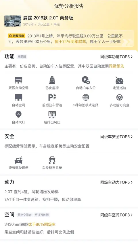 总结:这辆威霆 2016款 2.0T 商务版商务车各方面表现非常均衡。动力性能强劲,操控稳定舒适,制动系统可靠高效,非常适合商务人士和家庭使用。车内空间宽敞,座椅舒适,无论是长途旅行还是日常通勤都能提供舒适的乘坐体验。内饰豪华,采用高档材质,细节处理精致,彰显品质与品味。该车在市场行情中价格合理,是一款性价比较高的车型。需要注意的是,该车未提供检测报告,潜在买家应确保进行全面的专业检查以评估车况。尽管如此,这辆威霆 2016款 2.0T 商务版商务车依然是市场上的一款有力竞争者,值得考虑。