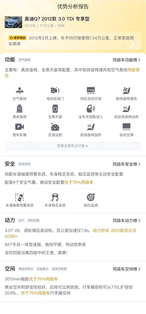 根据我们的评估,这辆二手奥迪Q7在各方面表现均衡,没有明显的短板。然而,由于这辆车并未提供第三方检测报告,因此在实际购买时,务必亲自到场进行详细的检查和试驾,以确保车辆的实际状况符合您的期望和需求。
