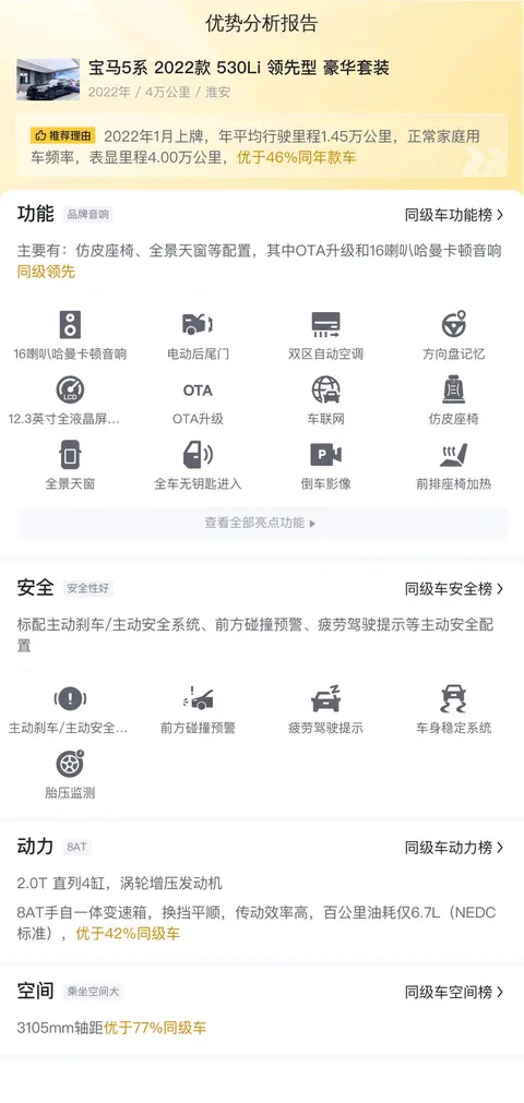 综上所述的新车含税价、用车成本、市场行情、优势分析、同款比价等数据仅供参考。在配置部分,因为二手车非标品,车辆可能会存在配置改装的情况,具体车况信息需要线下结合车辆实际情况进行综合参考。