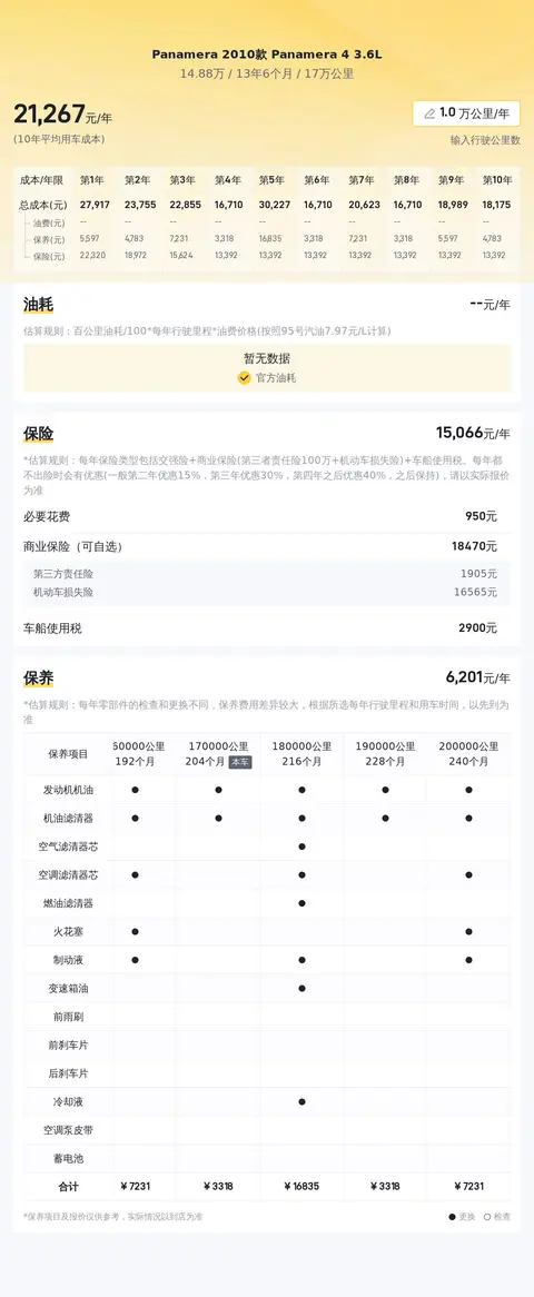 当前市场行情显示,这款二手保时捷Panamera的市场价格大约在13.54万至14.96万之间。当然,具体的售价会受到车辆状况、里程数以及维护记录等因素的影响。就用车成本而言,按照每年 2 万公里的行驶里程计算,包括保险、日常保养和燃油费用在内,平均每年的用车成本约为33,688元。需要注意的是,实际费用可能会根据个人使用习惯、油价波动以及车辆维护状况等因素有所变动。