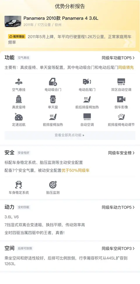 买二手车,配置信息也很重要,今天我们就来详细讲讲。这辆二手保时捷Panamera在动力方面表现不俗,搭载3.6L V6自然吸气发动机,最大马力300Ps,最大功率220kW,峰值扭矩400N·m,最高车速266km/h,百公里加速时间6.1秒。尽管是二手车,但其加速成绩仍然具有一定的竞争力。变速箱方面,该车采用了7挡双离合变速箱,换挡平顺且传动效率高。底盘悬挂方面,前双横臂式独立悬挂和后多连杆式独立悬挂的搭配使得车辆行驶稳定性得到保证。此外,该车还配备了电动吸合门、电动后尾门、定速巡航、倒车影像、前后驻车雷达等多项实用配置,提升了驾乘的便捷性和安全性。在舒适配置方面,真皮座椅、单天窗、前排座椅加热和记忆功能等配置为乘客带来了良好的乘坐体验。尽管是二手车,但其配置表现依然出色,能提供高级的驾乘感受。
