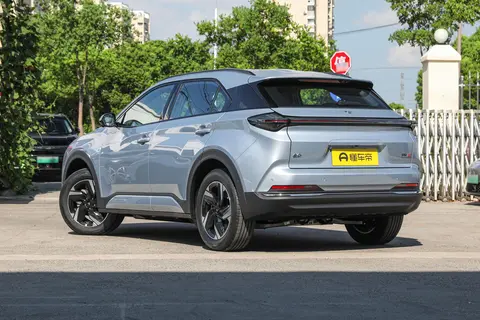 AION Y的车身侧面明显更加紧凑,但车身的比例没有违和感,很协调,前后悬都比较短,这种结构的车身设计,可以给座舱内腾出更大的空间;C住位置进行了部分的黑化处理,呈现一个三角形,看上去更类似悬浮式,在视觉感受上扩大了车内空间,同时还能给人带来些许运动感,AION Y的采用了隐藏式门把手的设计,轮圈大小跟哪吒X一样,也是采用的17英寸,但轮胎宽度和扁平比不同,AION Y的轮胎规格尺寸为215/55 R17,这方面哪吒X更好一些。轮胎宽大在一定程度上有助于缩短刹车距离,相对更安全一些。