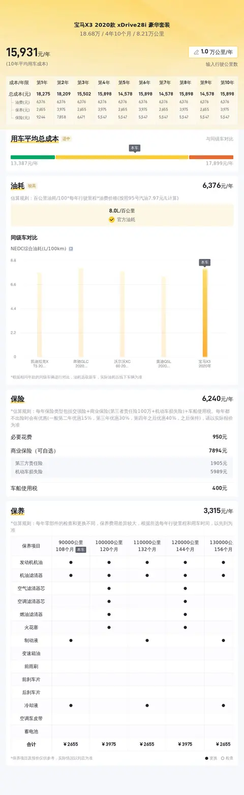 总结:报价低于市场行情价的宝马X3 2020款 xDrive28i 豪华套装,入手价压力不大,而且这款车属于越开越香的类型,把操控性能当饭吃的车友,选它准没错!值得一提的是,这辆车虽有剐蹭和改装,但并非事故车、泡水车或火烧车,整体不影响正常使用。按照每年2万公里行驶里程计算,10年平均用车成本是15724元/年,属于正常水准。最后,再提醒一下,买车一定要量力而行,根据自己的实际需求和预算做出合理的选择。