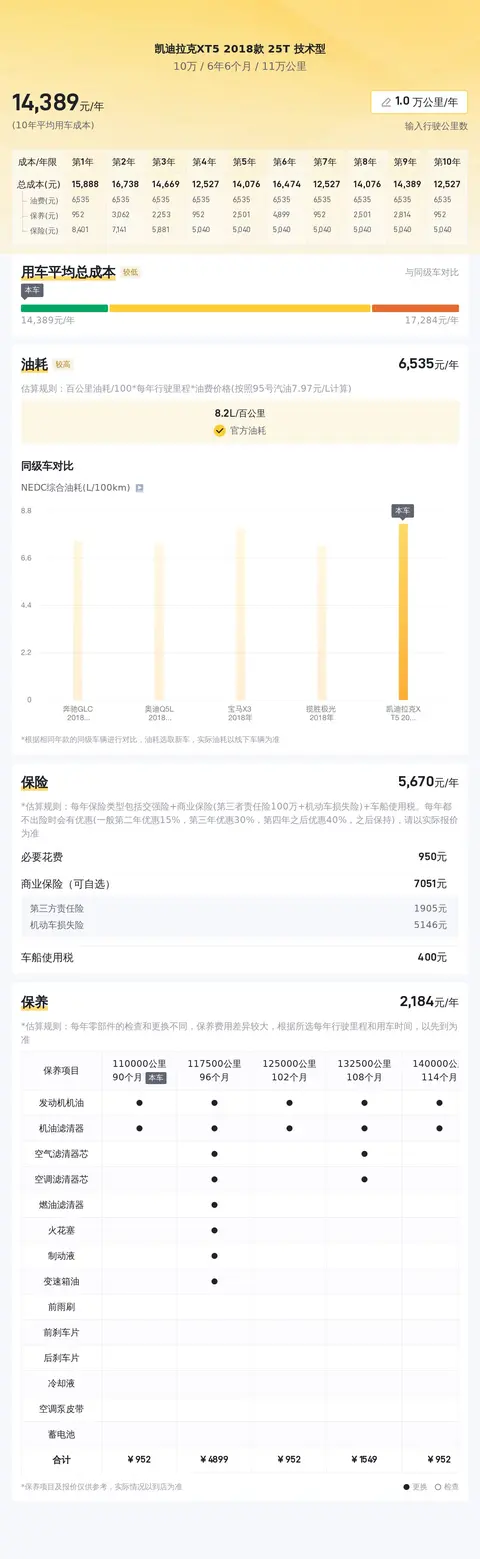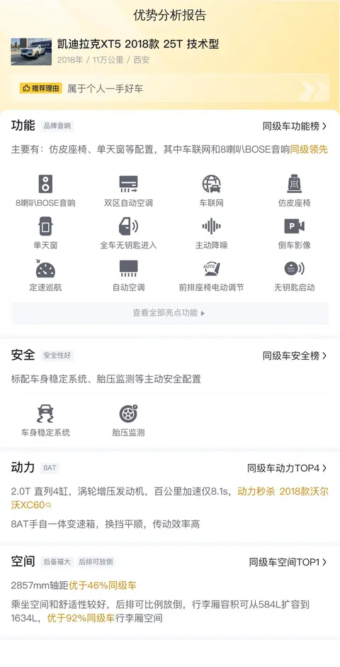 这是一辆2018年5月上牌的凯迪拉克XT5 2018款 25T 技术型,白色外观,至今行驶了11万公里,国V排放标准,未过户。车源位于西安,上牌地也在西安。这款车的新车指导价为35.99万元,目前二手车报价为10万元。