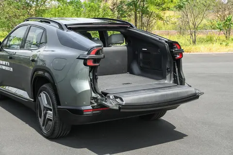 长安启源E07的车尾设计采用了时下流行的大倾角溜背样式,环形尾灯与横向灯带相互映衬。值得一提的是,启源E07之所以能实现多种形态转换,其秘密在于后尾门可向下翻折,承载能力达到150kg,且后备厢与座舱之间并无隔断,从而提供了更为宽敞的实际使用空间。
