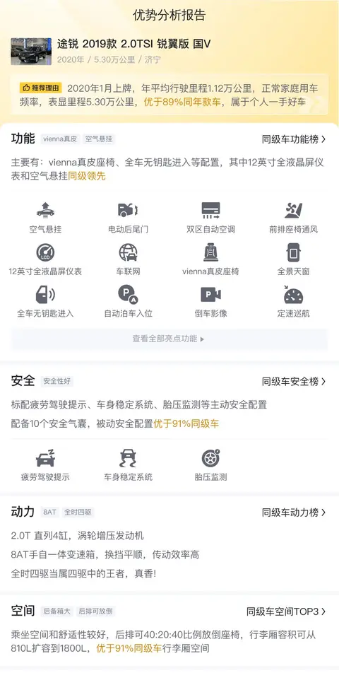 综上所述的新车含税价、用车成本、市场行情、优势分析、同款比价等数据仅供参考。在配置部分,因为二手车非标品,车辆可能会存在配置改装的情况,具体车况信息需要线下结合车辆实际情况进行综合参考。